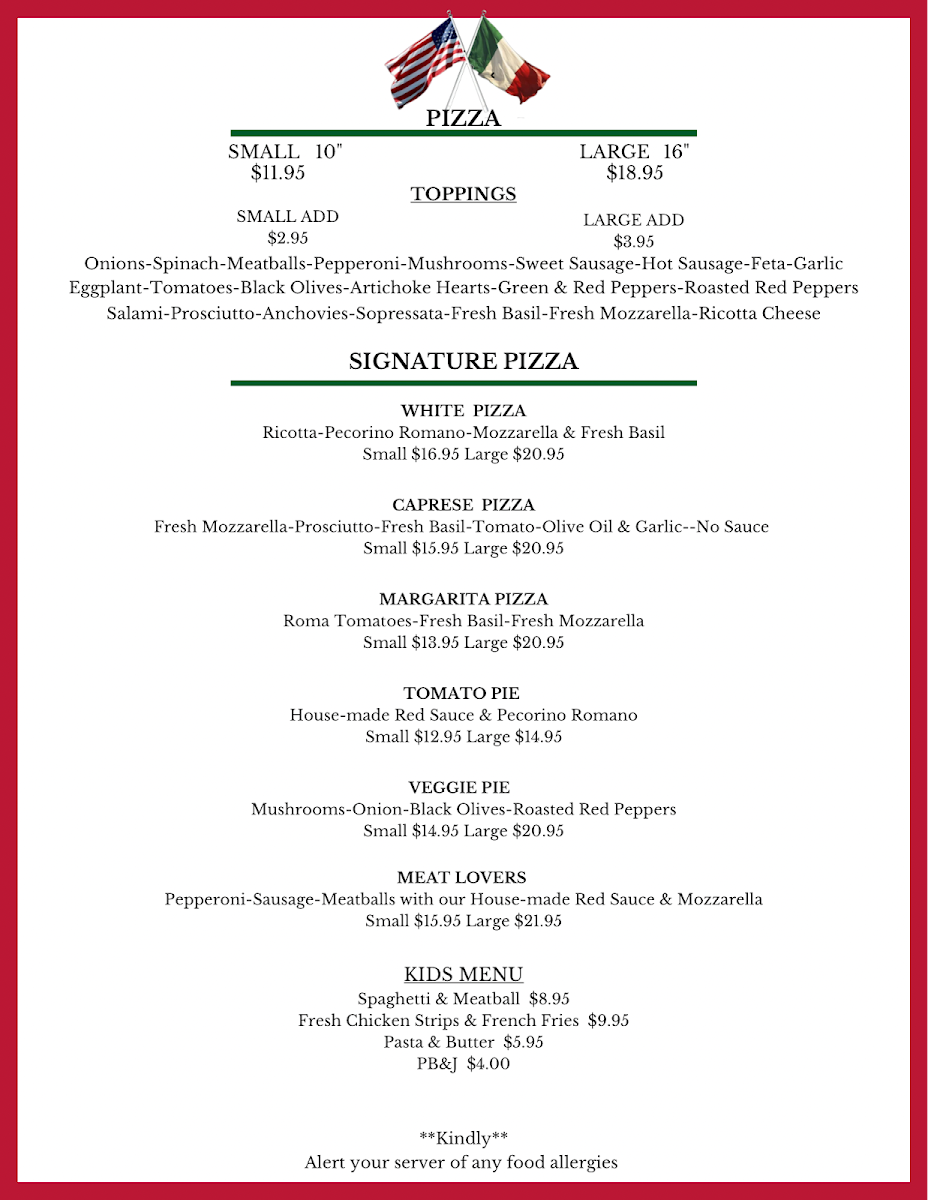 Start your culinary journey with their fresh seafood offerings, like the Broiled Haddock Oreganata and Shrimp Scampi, each brimming with flavors of lemon and garlic. For pizza enthusiasts, the Large White Ricotta and Margherita are crowd favorites, crafted with generous toppings and fresh basil.